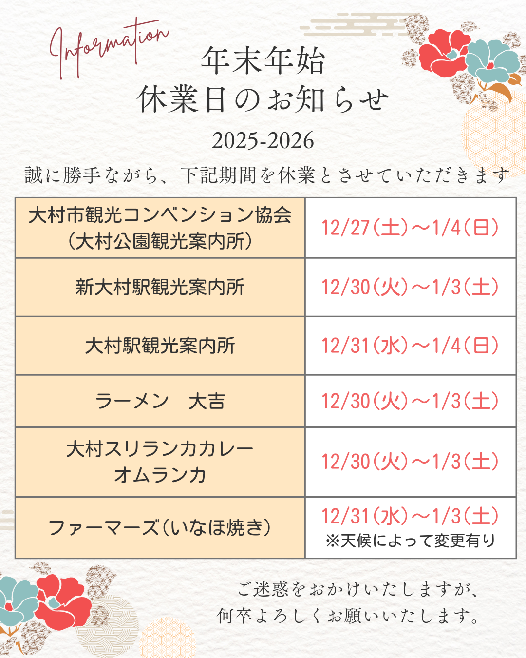 一覧へ戻る 年末年始休業のご案内2025-12-18[お知らせ]チェック重要 年末年始休業のご案内誠に勝手ながら上記期間中、休業とさせていただきますご利用のお客様へはご不便をおかけしますが、ご理解のほどよろしくお願い申し上げます。